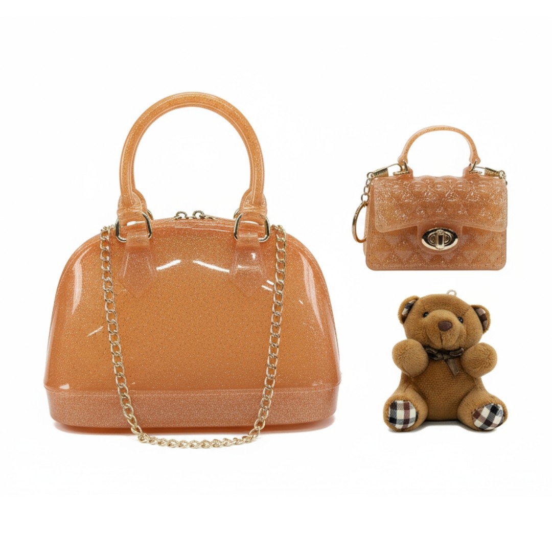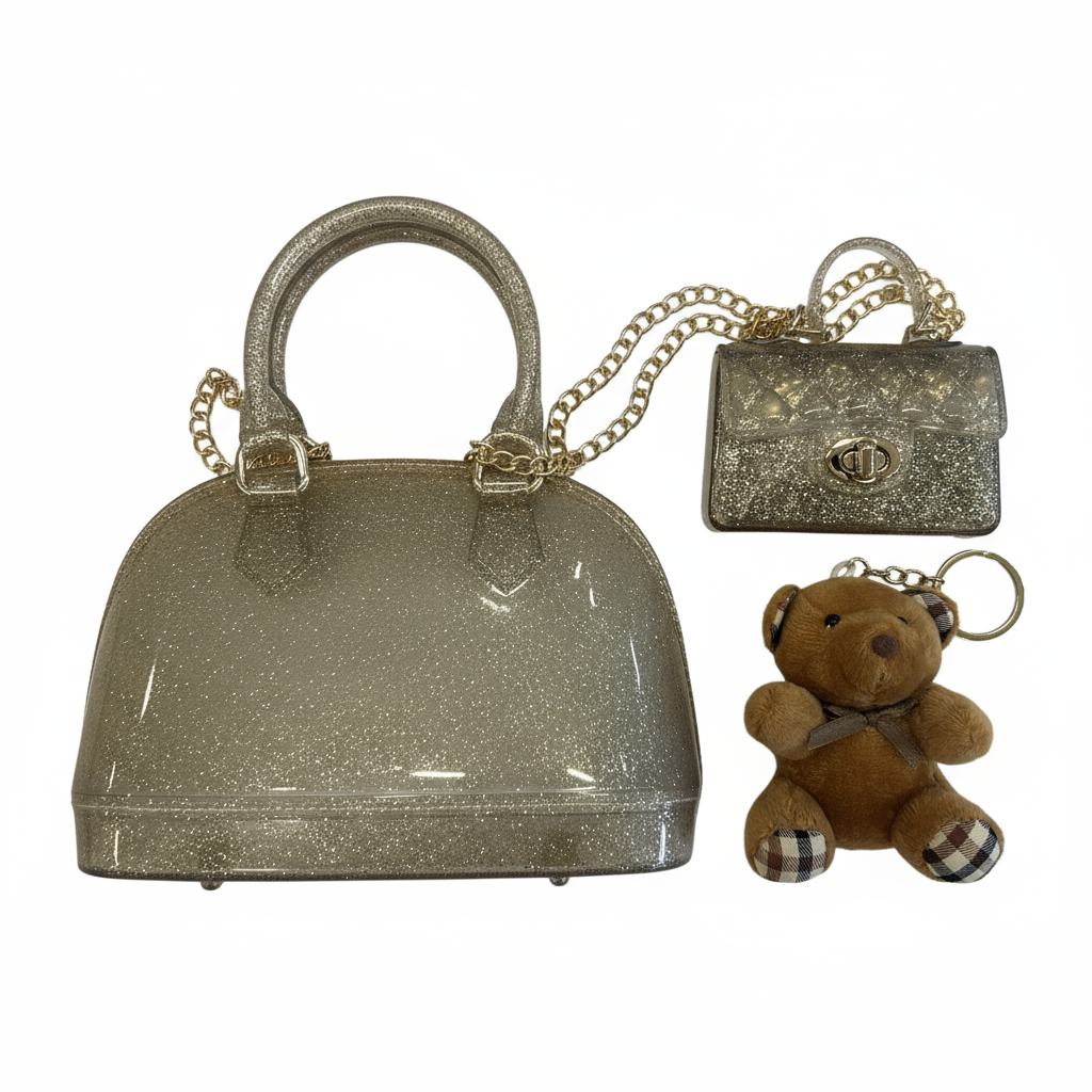 Gift set for girls, containing: handbag with shoulder strap, mini clutch bag with shoulder strap and teddy bear keychain.